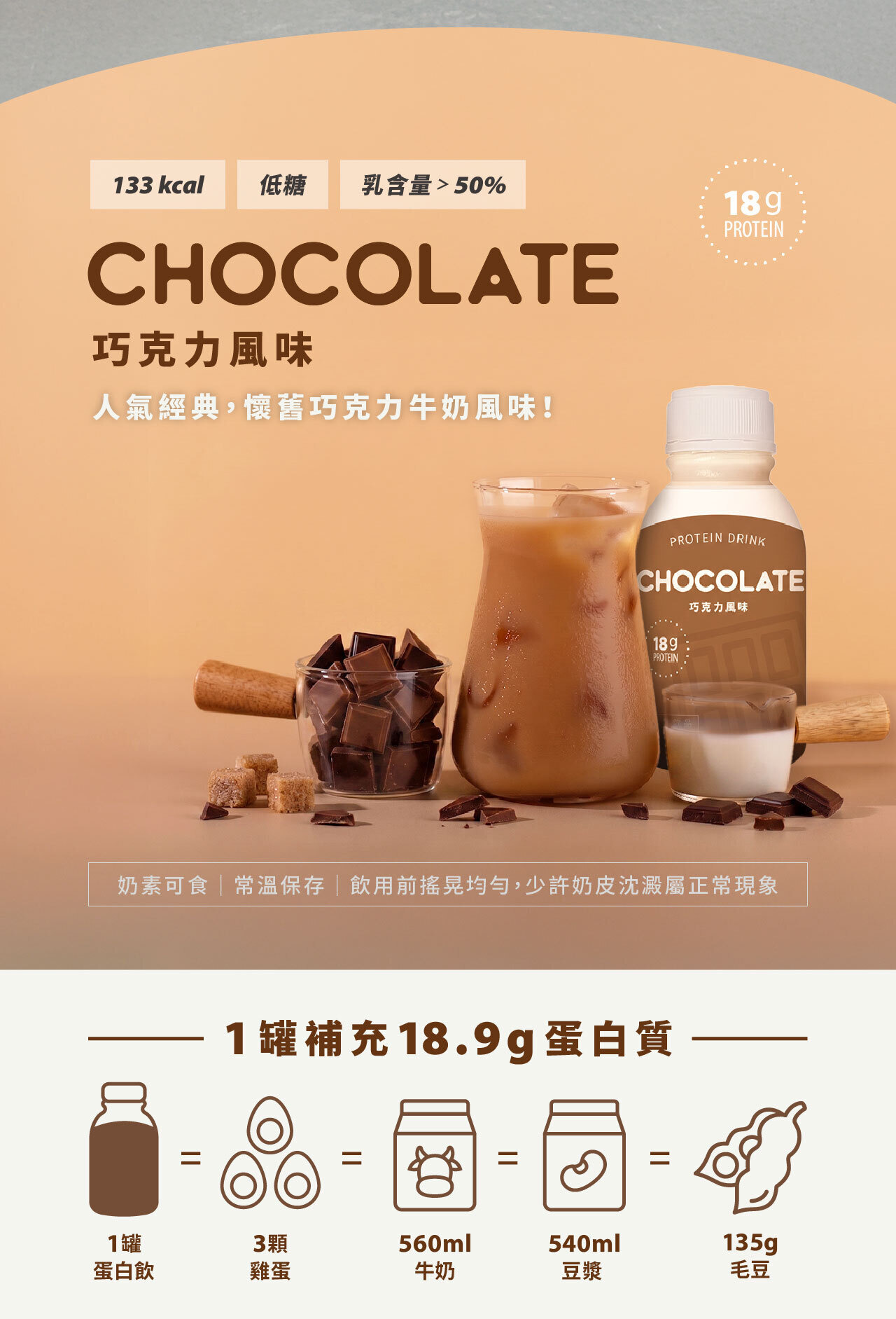 成份: 水、濃縮牛奶蛋白、脫脂奶粉、生牛乳、全脂奶粉、可可粉、香料、脂肪酸甘油酯、濃縮乳清蛋白、微結晶纖維素、結蘭膠、海藻酸丙二醇、碳酸氫鈉、蔗甘寶[蔗糖素(甜味劑)、醋磺內酯鉀(甜味劑)、乳糖]、維生素 E