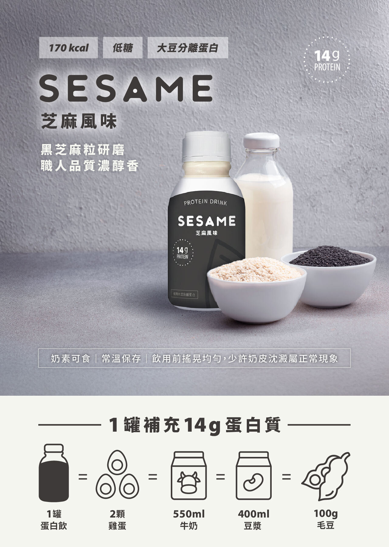 成份: 水、黃豆、芝麻粉、大豆分離蛋白、蔗甘寶 [蔗糖素(甜味劑)、醋磺內酯鉀(甜味劑)、乳糖]